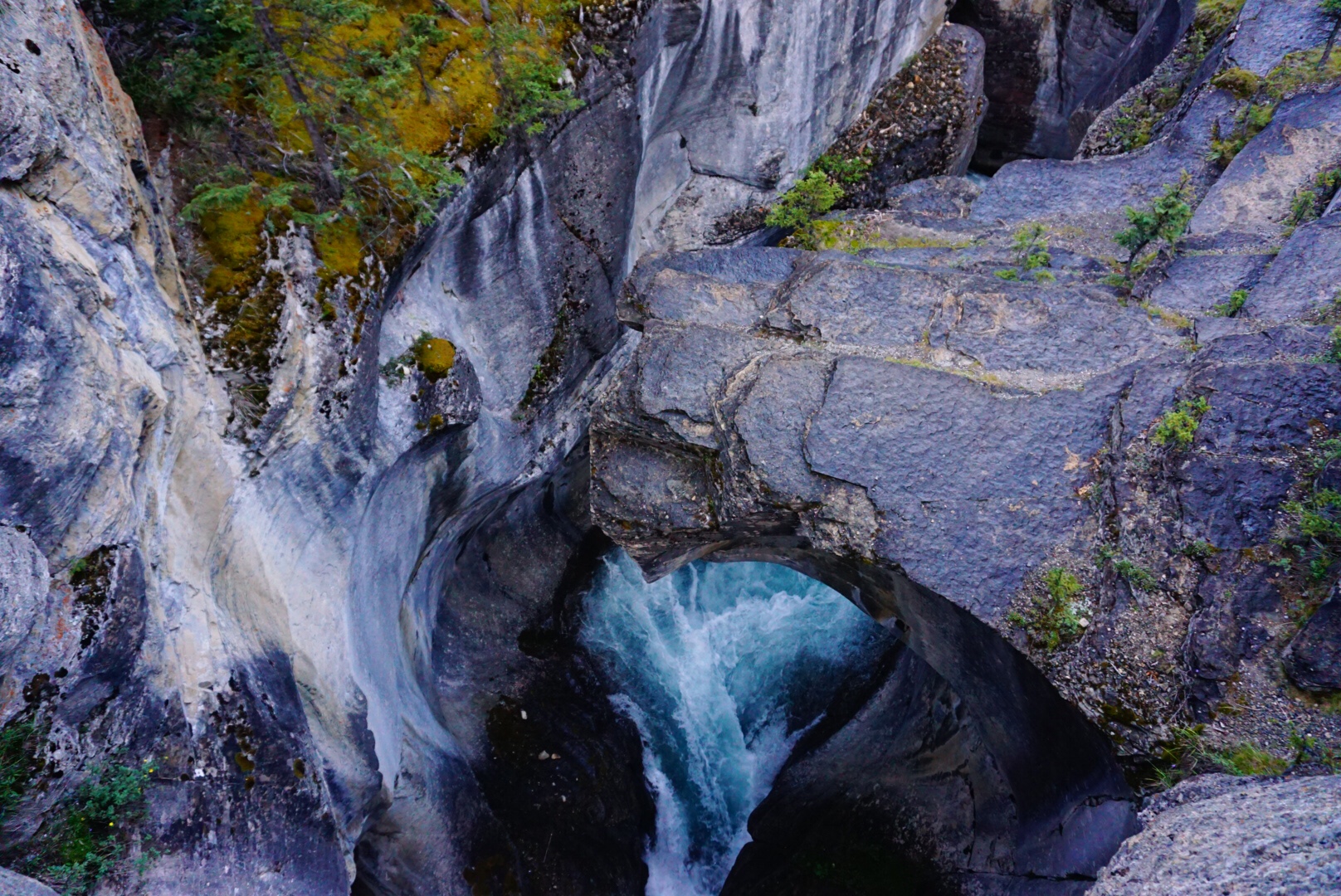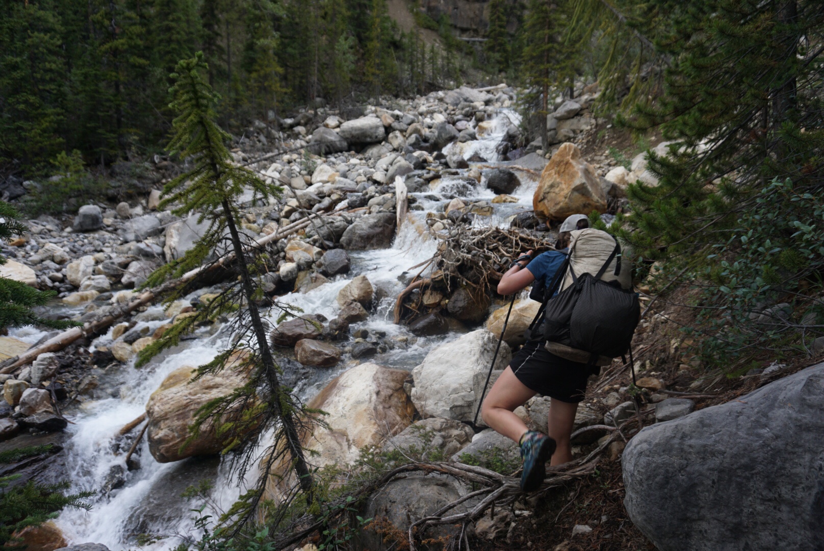 The trail passed on the north side of the massive Saskatchewan River before crossing the road and heading back into the Wilderness and Banff National Park. We started climbing steeply and soon crossed over the 52nd N parallel of planet earth. The trail meandered up a deep slot canyon called Owen’s Creek that soon turned into a steep, tricky and endless embankment. The trail was hardly a trail, and there was more than once where a fall would have led to serious injury. The mantra became…don’t fall.