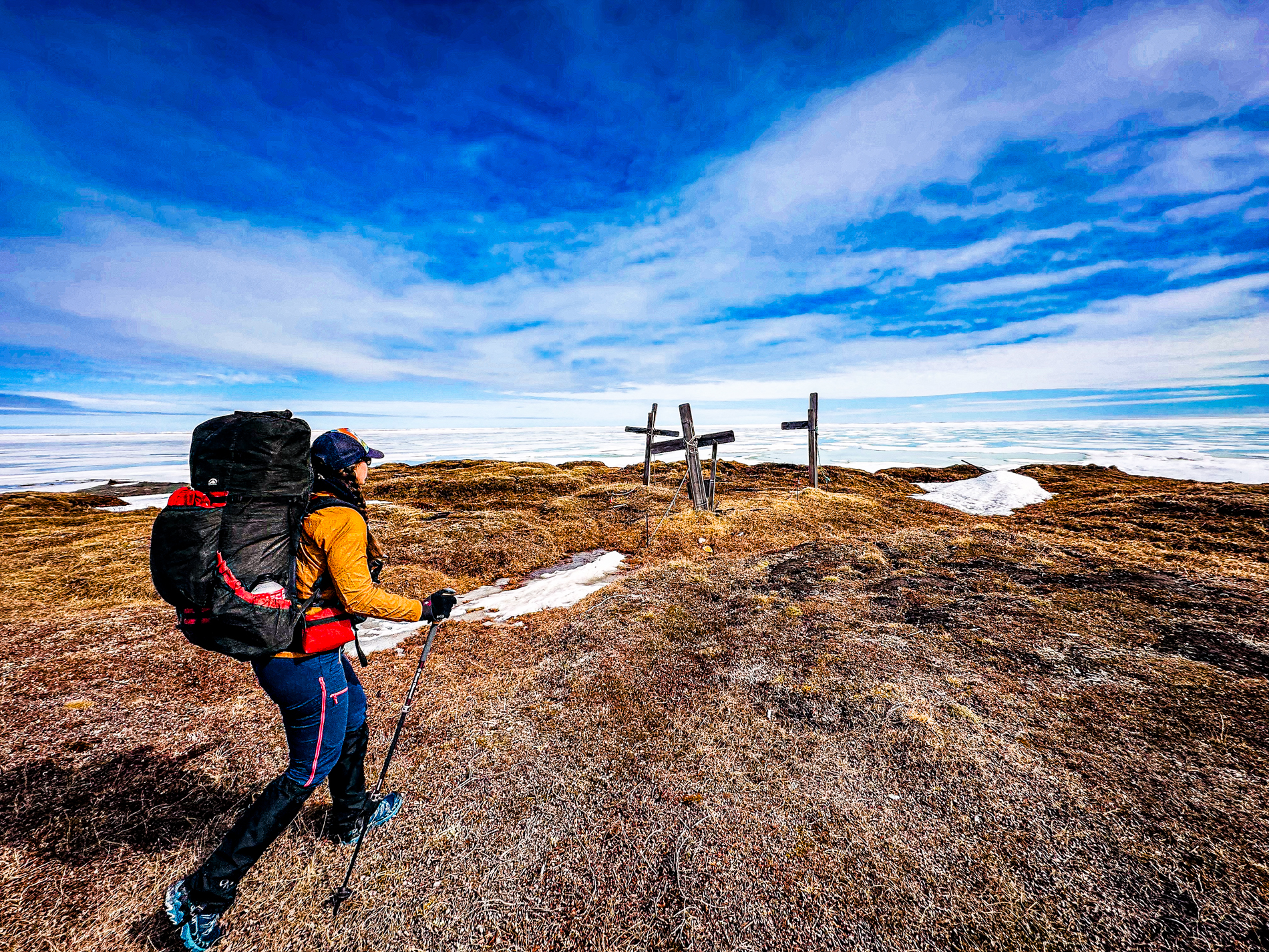 We ended up camping after my second slip because I was not warming up and a brisk wind was coming from the north. We’d hoped to go further and get away from deep polar bear terrain, but at this point, hypothermia was a bigger risk than a polar bear. We’d seen no bear tracks today so at least there probably wasn’t one roaming in the direct vicinity. We got the shelter up quickly, and Elaine finished the set-up while I put on some dry clothes and crawled deep into the sleeping bag, She cooked an amazing dinner with hot tea and I was quite warm before falling asleep. I definitely don’t want to be a burden on day one, and I promised myself I would make it up to her in the weeks and months ahead.