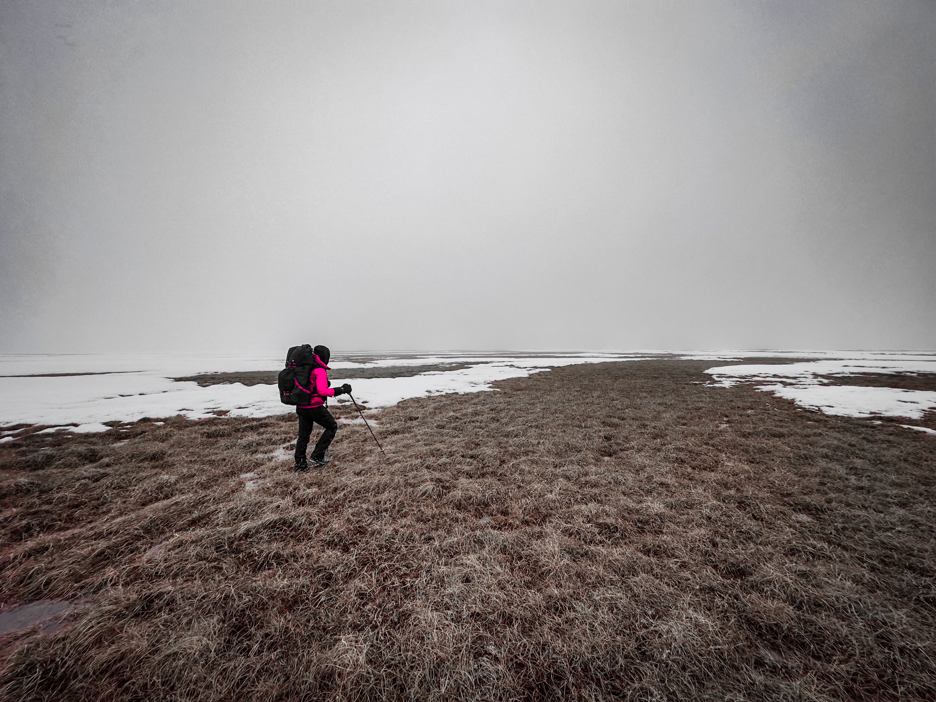 As the day progressed it got foggier and colder. The wind seems to pick up and blow from the north in the afternoon. We set up camp after five hours of hiking on what seemed like the only dry patch of tundra for miles. There is a certain dream quality to the landscape. There is water everywhere, and if we didn’t have a GPS telling us otherwise, I’d guess we were still camped right on the ocean. A fog has engulfed our little dry island of tundra turning the light diffuse. Since it’s mostly flat, save a few hummocks on the tundra, and the sun never sets, it feels like time and place have no meaning here.