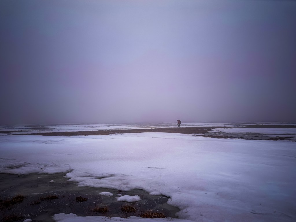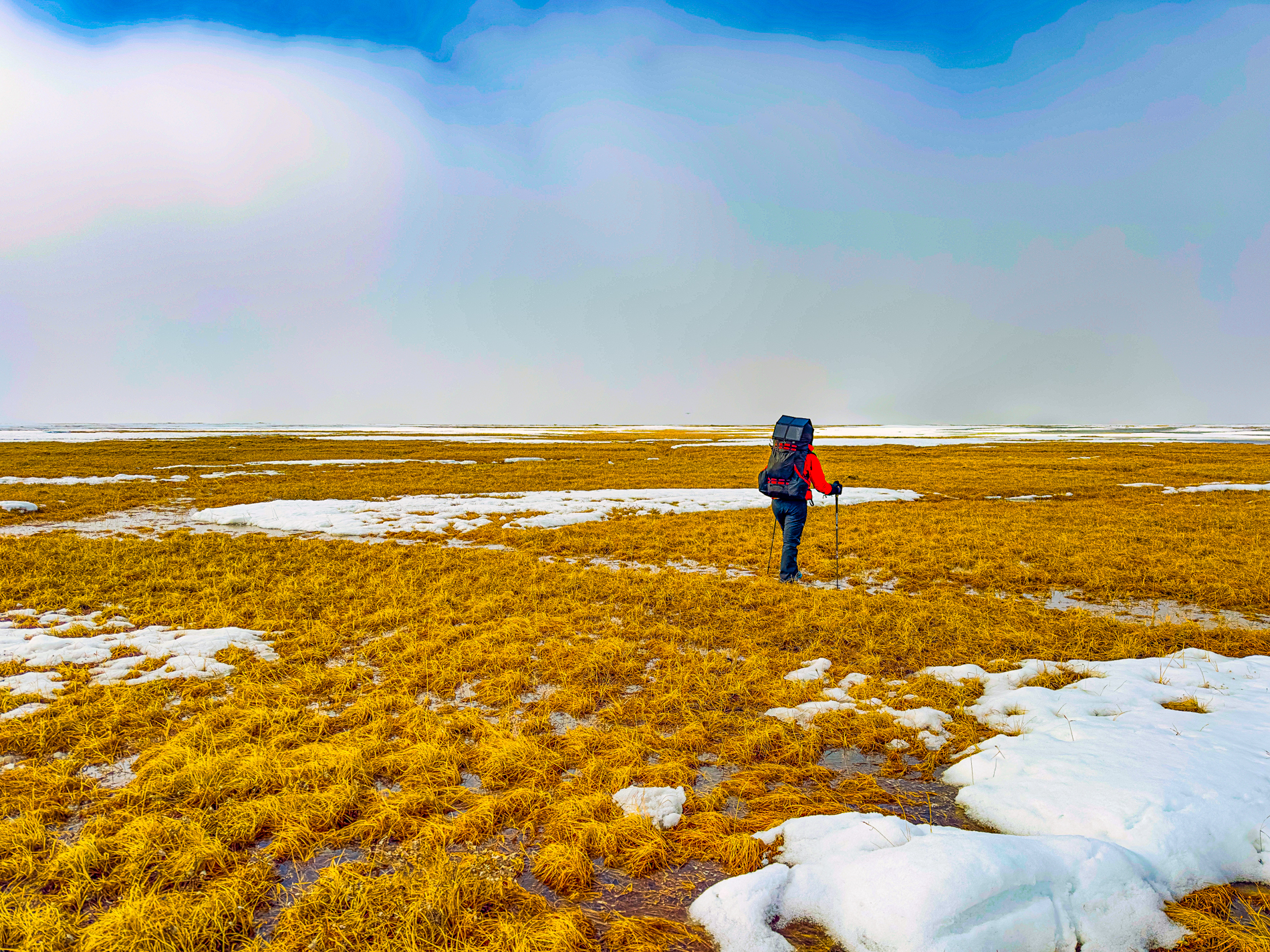 Today we hiked south between two rivers flowing out of the mountains. We can’t see the mountains today but we know they are there. The terrain today was a mix of wet tundra, wet snow and occasional dry lichen patches. We went 12 miles and put some distance between us and the coast since the coast is polar bear country. It’s certainly possible polar bears could roam this far inland, but every step we take puts us further from their domain. About 1/2 mile into today we crossed massive bear prints heading north. That certainly got our attention. It’ll be a day or two before we’re out of Ursus maritimus terrain. Until then, I’ll try and wear some eyes on the back of my head! They are probably not here this time of year when the sea is still frozen and they can hunt seals from ice flows, but after our encounter with a polar bear in 2022 when they were also “not supposed to be there that time of year,” I figure it’s fair game for the next couple of days when it comes to these characters.