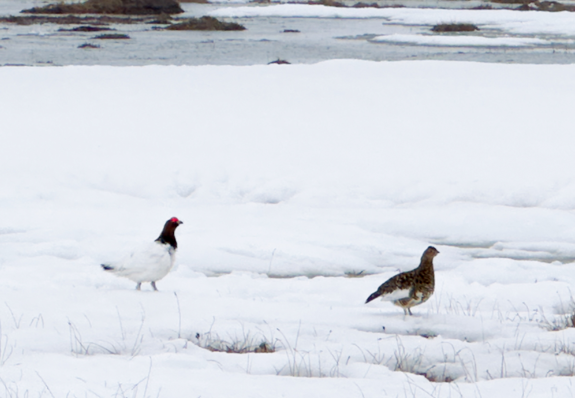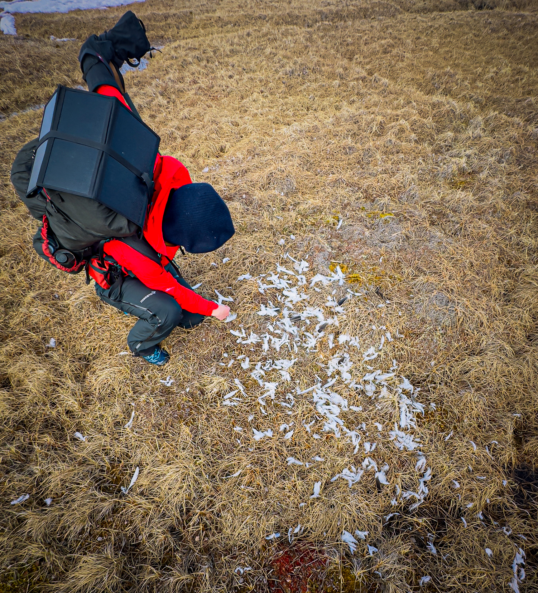 It’s a shame we have to put miles between us and the coast for safety reasons because the 8-10 miles inland from the sea ice is fascinating. The bird life is copious and wild. We saw another Snowy Owl, more Willow Ptarmigan than I can count and a Greater White Fronted Goose, a new one on my list. The echoing calls of the goose fit in perfectly with this arctic landscape, their quacks carrying across the foggy tundra. Elaine and I talked about how we’d like to spend an extended amount of time in this zone in the future and ways to do that, perhaps bringing a lightweight electric fence and spending more time with the birds.