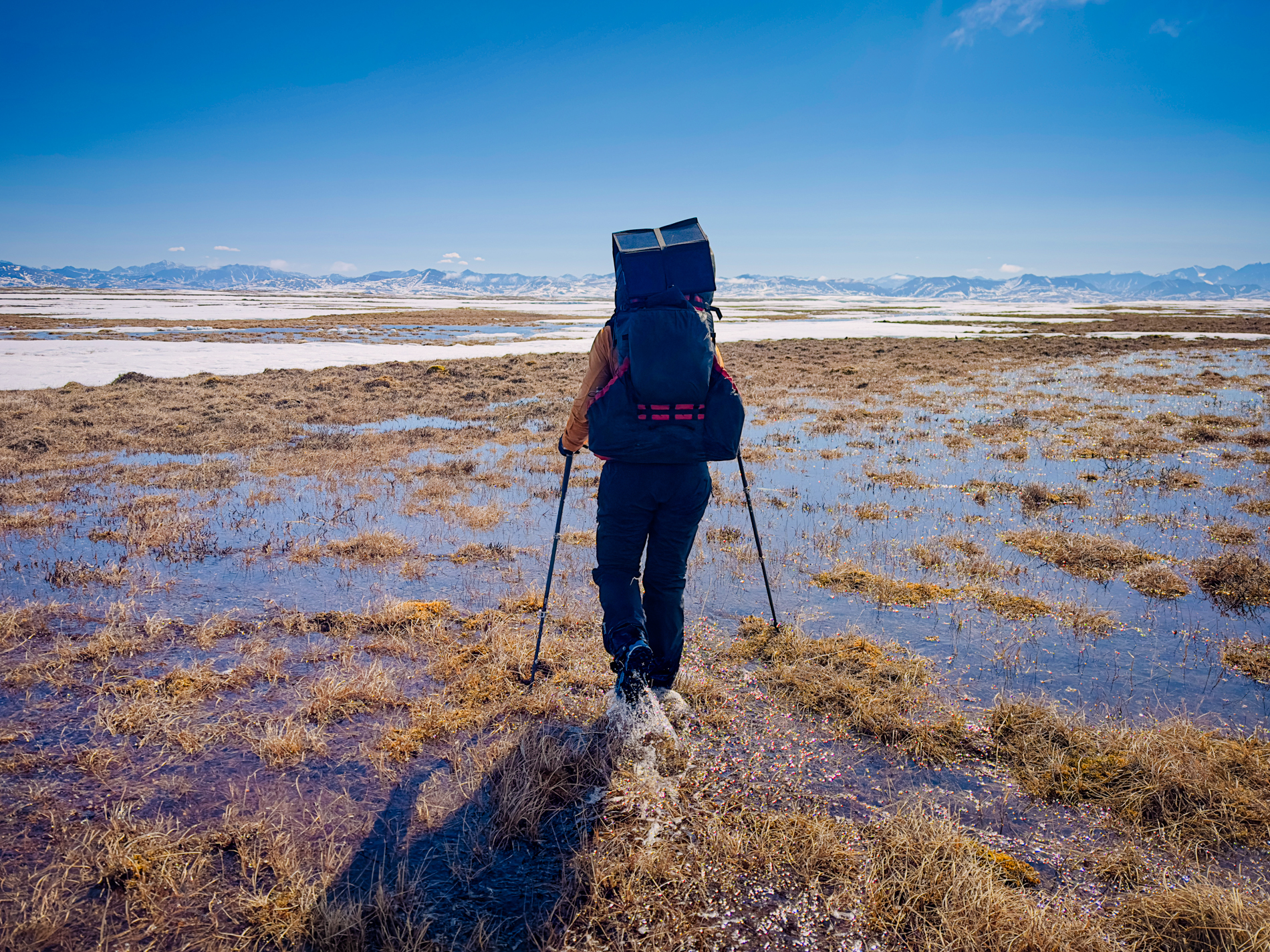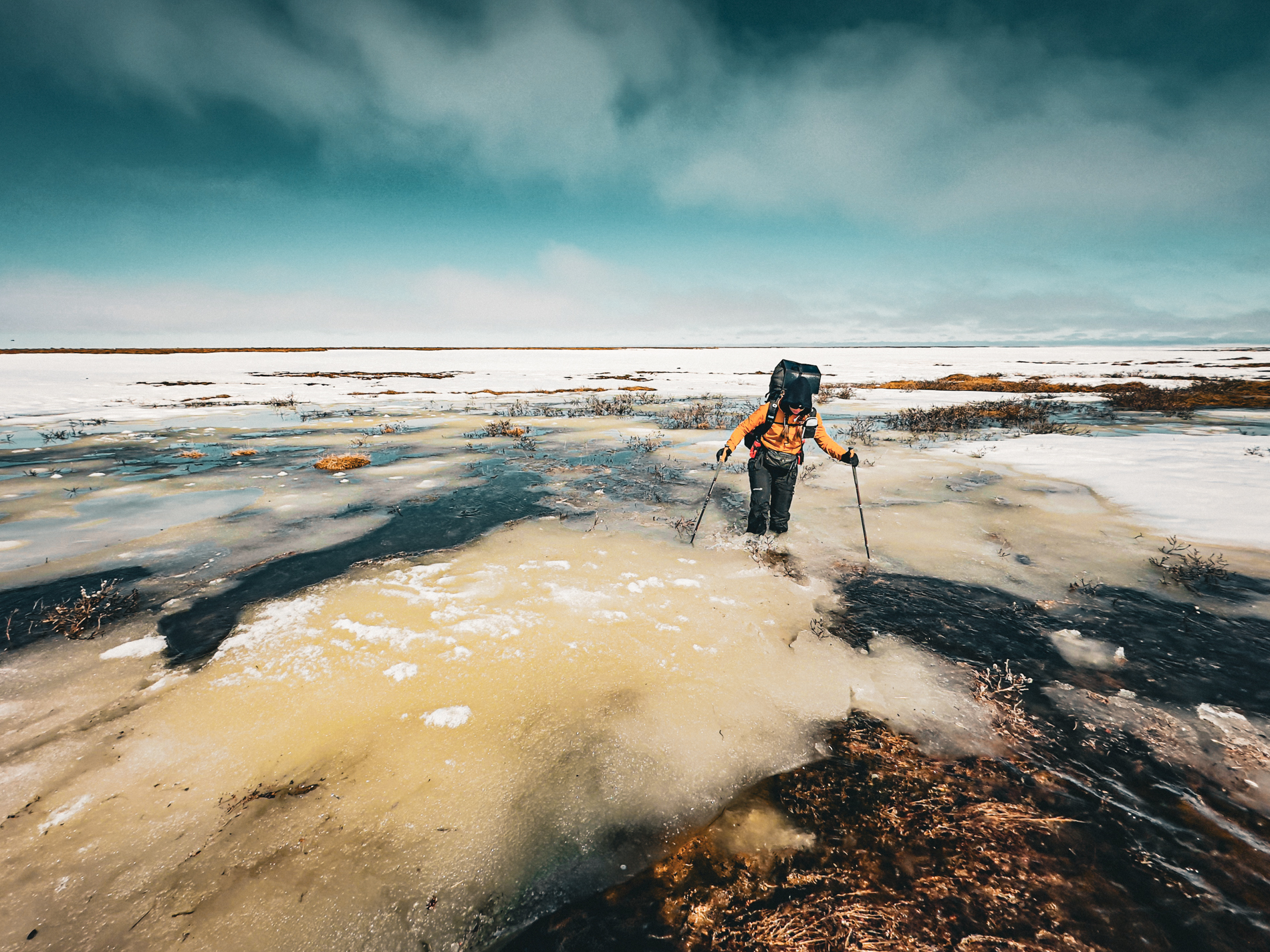 While the ground is frozen, I wouldn’t call the walking easy. We enjoyed a cornucopia of walking variations, from dry tundra walking, to squishy tundra walking, to snow tundra walking, to flowing water on top of tundra walking, and our favorite, crusty ice and snow with water flowing underneath tundra walking. There was something for everyone, and every five minutes it changed staving off boredom.