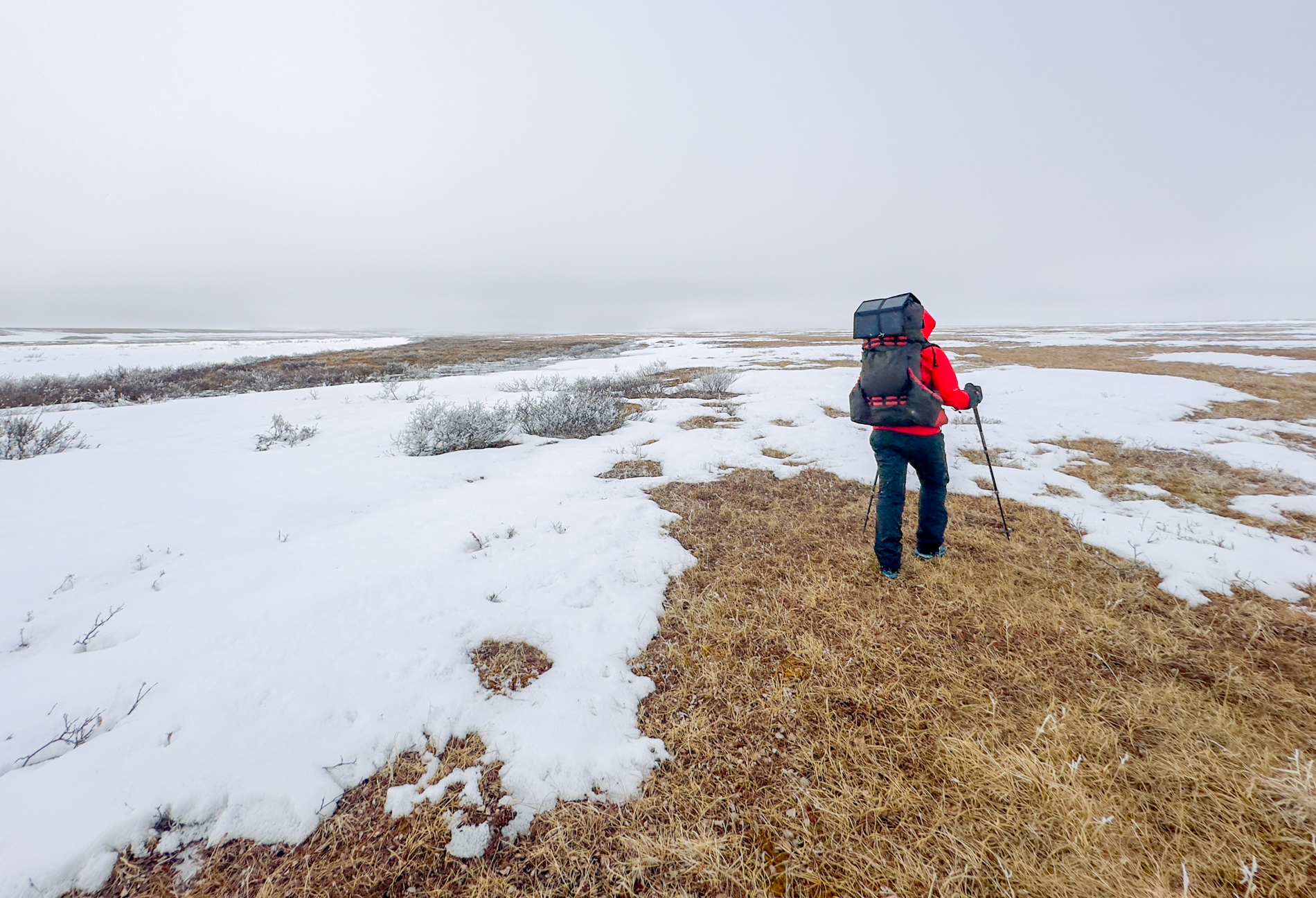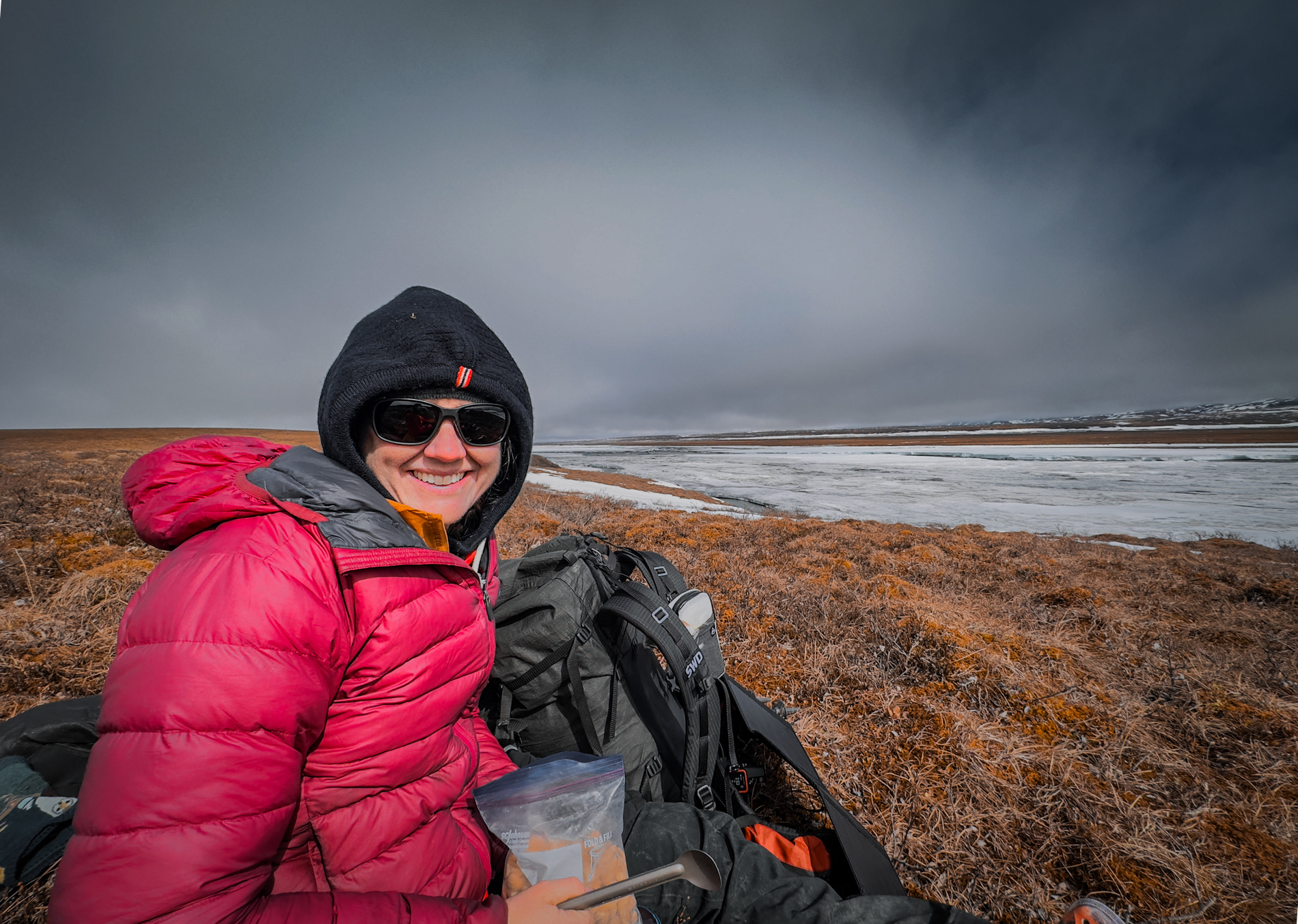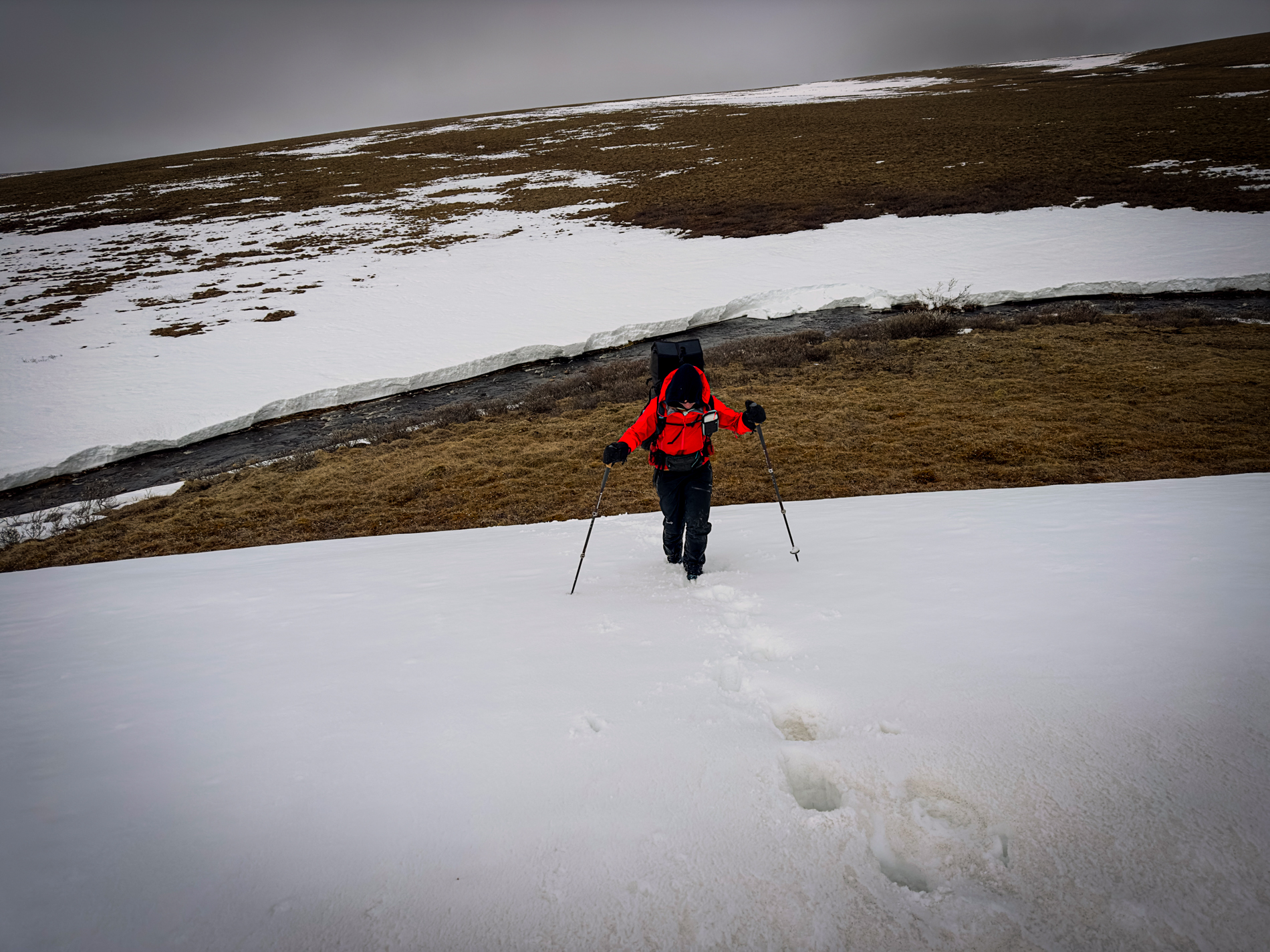 The tussocks continue and camping is challenging to find. We find a small 6’x6’ section of relatively smooth tundra, and while it is slopey it’s the best option around. Access to water requires crossing a hundred-yard-long section of mushy ice snow, and then trying not to fall into the creek that flows with ice and slush. I volunteer for the task, remembering that promise I made after day one to Elaine.