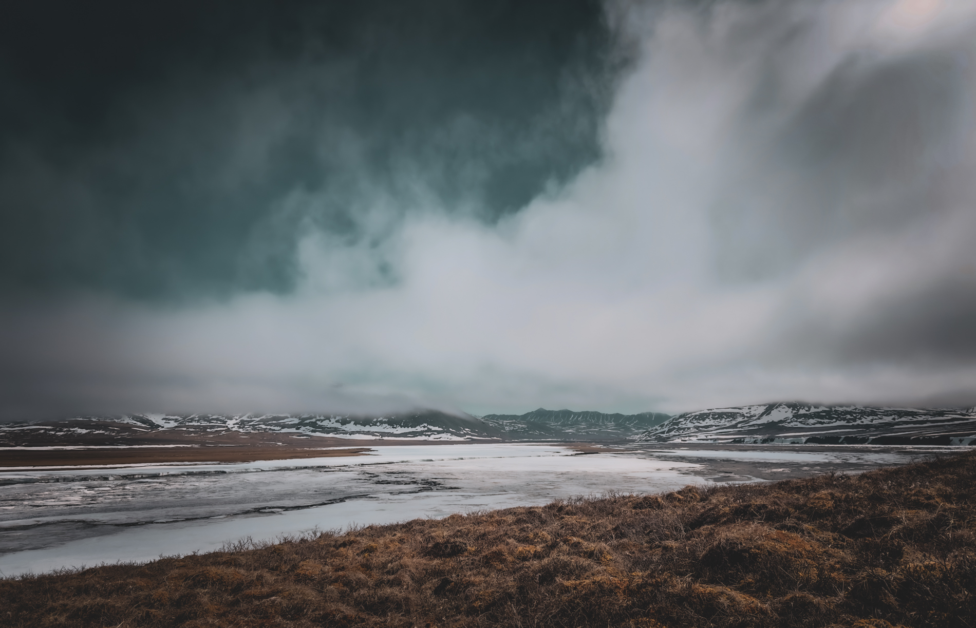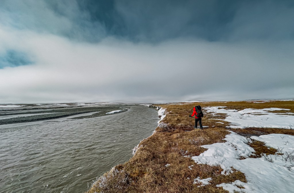 The river is a half-mile wide and filled with aufeis. Aufeis is caused by the river freezing, and then fresh water overflowing, freezing again, and so on. This process can go on all winter and create thick shields of ice that take the entire summer to melt. Aufeis can make good travel, but on this day when the temperature is staying below freezing, walking on ice with a sharp northern breeze is unappealing and, more importantly, unnecessary. We divert up a small ridge to avoid the big river, butt slide down a section of ice straight into a smaller river, cross out the other side and keep climbing. From here, we can see the Brooks Range in her full regalia, vertical and immovable, but we will not get there tonight.