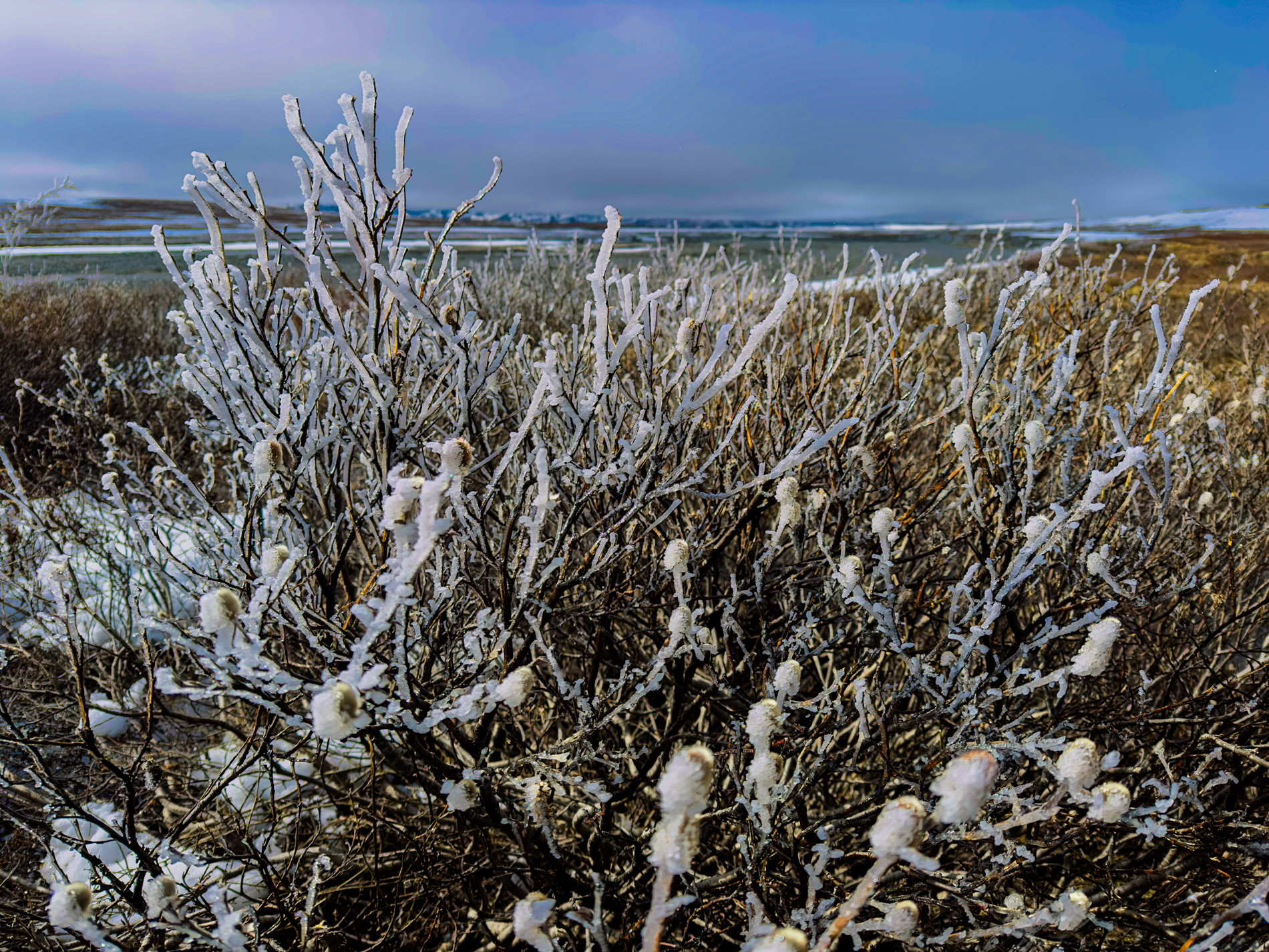 June 11 on the North Slope is not like June 11 in most places. We both woke up around 3 am cold in our sleeping bags. They are rated to 20° and we were bundled up in wool from head-to-toe, so it must have dropped well below that. The world was covered in a light film of ice this morning. My long johns, hiking pants, sweater, rain gear, heavy mitts and ski cap felt under-gunned even while moving. So it is in the Arctic. The willows along the river shimmered with crystalline ice hanging off the branches. At one point, snow started swirling around the air, turning to fine particles of ice, and the world sparkled. The sun broke through the clouds for a second, turning that sparkle into a blinding disco ball of light.