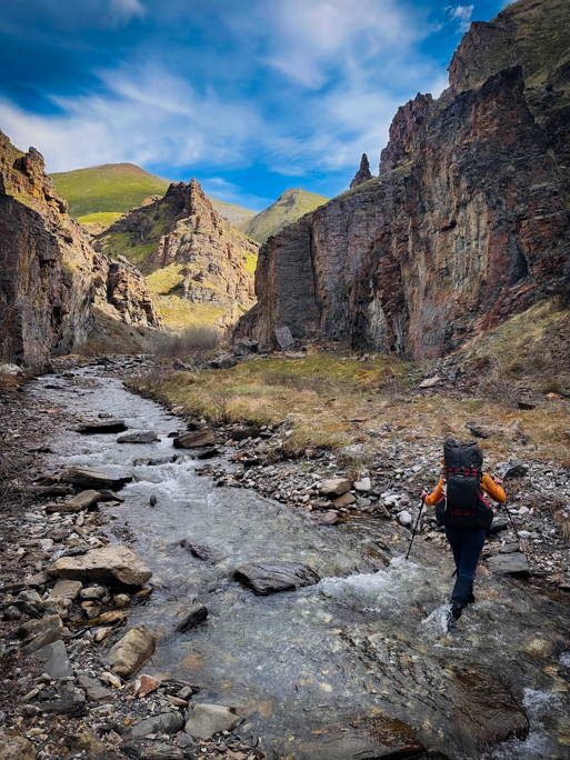 The wind picked up and the sky turned dark to the west, booms echoing off the massive cauldron of mountains surrounding us. We scampered and put up our shelter, just beating the downpour, snacking and hoping the canyon we were in didn’t flash flood. By the time I’d sliced a couple pieces of cheese, the rain stopped, moving east, rumbling as it departed.