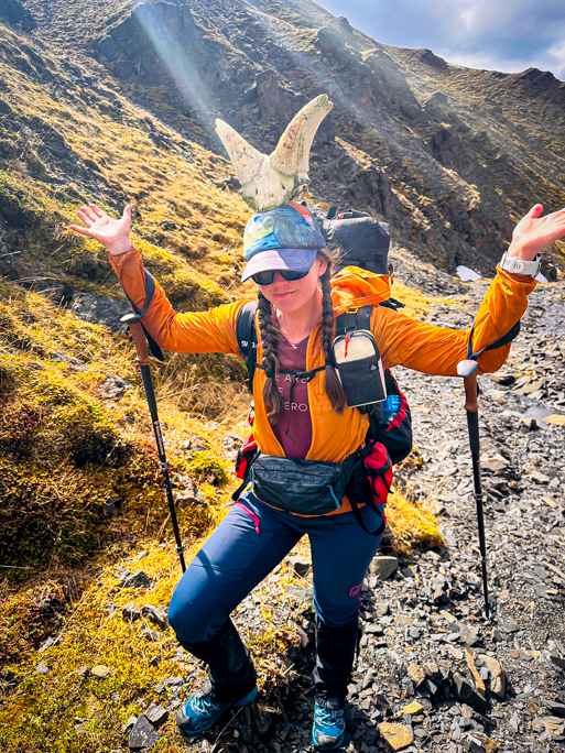 We descended to a creek bed, which was challenging travel as the creek was too swift and rocky to walk in, but the brush on the sides made for difficult bushwhacking. We forged on, trading the lead, trying to pick a smooth line through the brush, shouting bear calls, looking for somewhere to camp. We found some small hills that looked like nice camping, but the wind raged and made setting up camp unrealistic.
