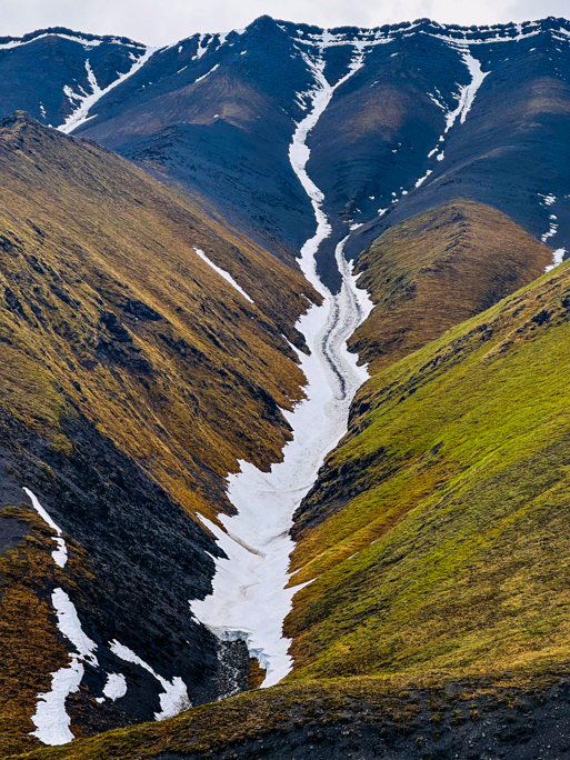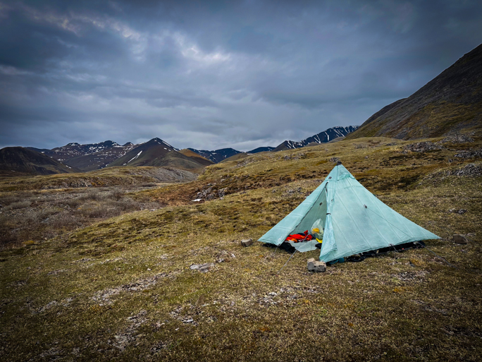 We headed north, rounded a bend, got ourselves out of the wind and set up camp on a beautiful tundra bench overlooking massive mountains to the south, the very heart of the eastern Brooks Range. Tomorrow we head north, to our cache, our first break and first objective of this winding trail.