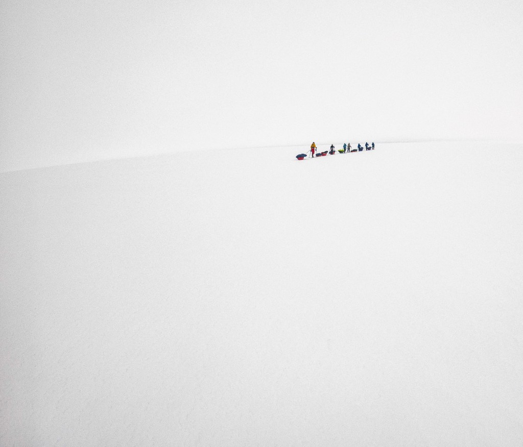 Travel itself was uneventful. The snow was consistent and forgiving, and the terrain rolled gently upward. We moved steadily, each of us tucked into our own thoughts, the line of sleds stretching out and compressing again as visibility shifted.
