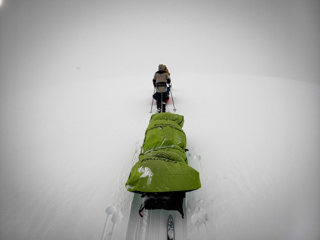 Not windy, not stormy, just empty. The kind of whiteout where the horizon dissolves and depth disappears, where you stop trusting your eyes and start skiing by compass, GPS, and instinct, except for instinct tended to send the course in circles. Progress became incremental and oddly exhausting. We switched navigation pairings, an experiment meant to spread the workload and reset rhythms. Sometimes that works. Sometimes it exposes friction you didn’t know was there.