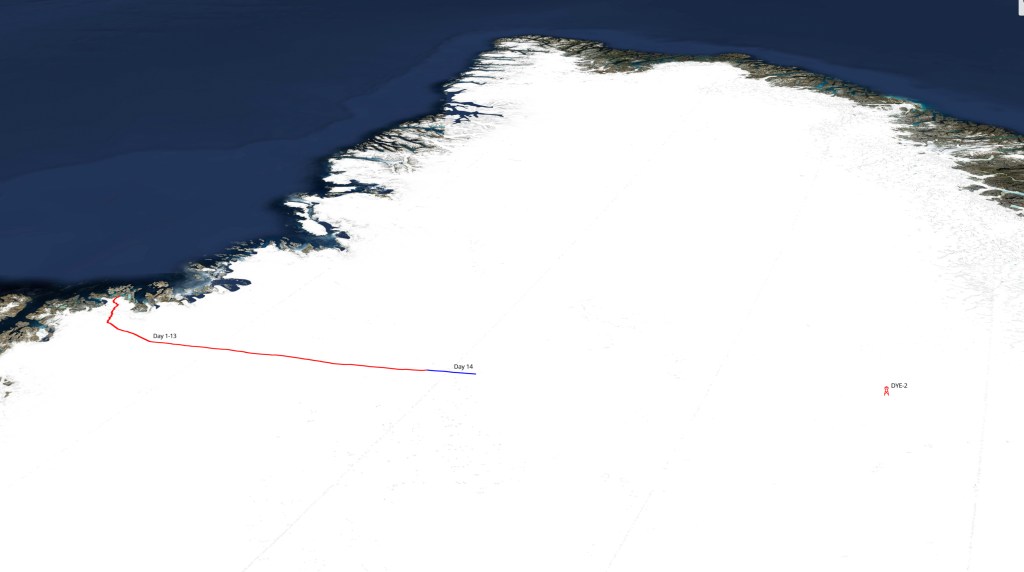 Wind pressed at our backs, snow streamed low across the surface, and visibility shifted minute by minute. It wasn’t a sudden change from yesterday, just an intensification. More snow. More wind. More cold. As we climb toward the summit of the Greenland Ice Sheet, the margin for error feels thinner. Snow has been falling steadily for days now, and though the wind came mostly from the east, offering a tailwind, it carried weight.