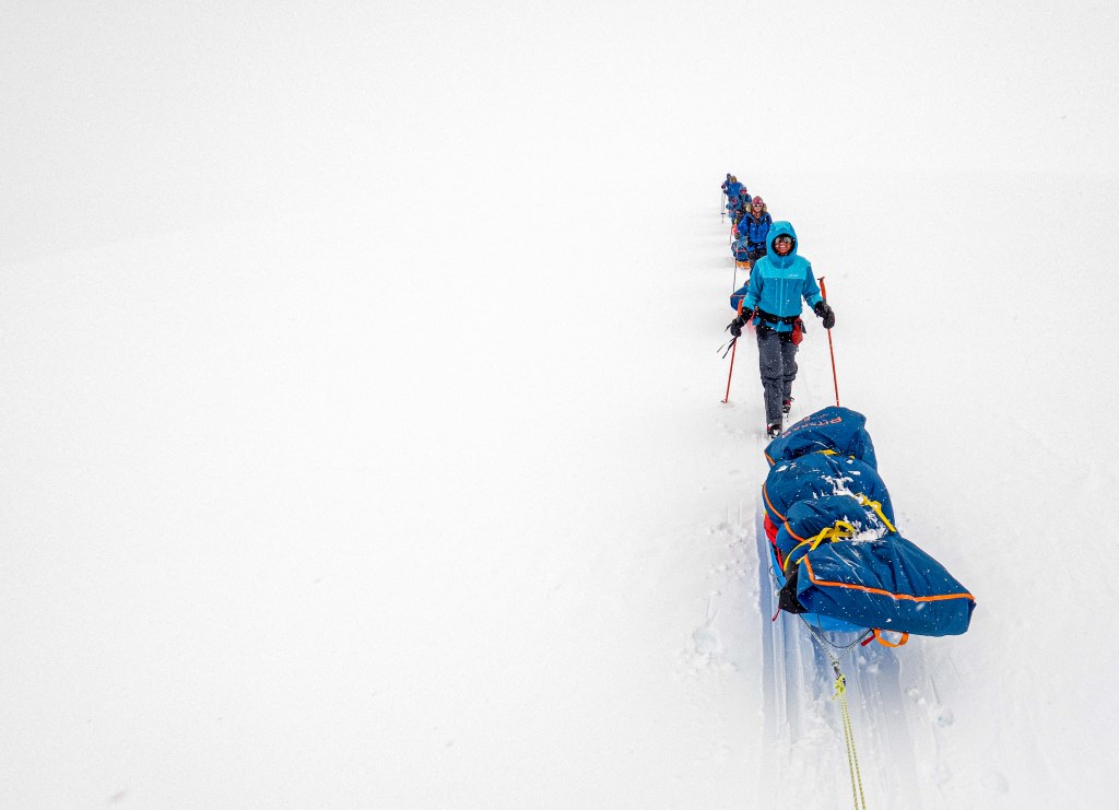 Travel demanded focus. We broke trail through six to twelve centimeters of fresh snow all day, rotating leaders every thirty minutes. The system worked. Efficient. Deliberate. The effort felt familiar, like a long training day back home, except the track stretched endlessly and the consequences of fatigue were real.