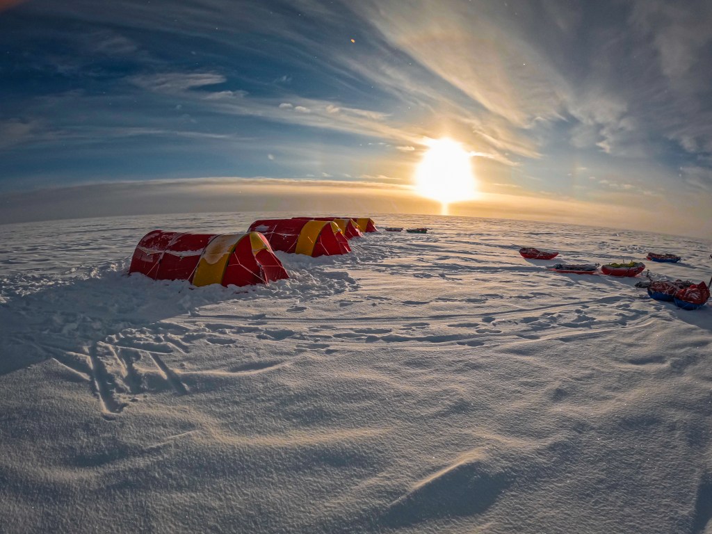 The skiing beyond the summit was still slow. Cold snow refused to glide. The descent existed mostly on paper. It would take days before gravity truly made itself known. When we reached camp, the wind returned with purpose. One of the tent poles split, tearing a small hole in the sleeve, and fingers froze again as we worked through the repair. It was a fitting end to the day. Nothing here comes easily, not even rest.