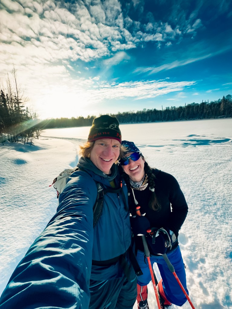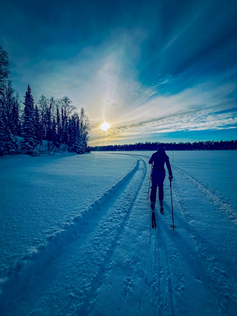 We stepped out the door, put our skis on in the driveway and followed the short trail we had skied the night before, only to realize it led nowhere in particular. A look at the map sent us drifting toward the lakes instead, where the trail widened into something better. Snowmobile groomed lines stretching for miles, sometimes marked, sometimes not, winding through woods and across frozen water. It is a strange, wonderful middle ground here, not quite frontcountry, not quite backcountry. Too narrow for skating, often without a track, but perfect for moving freely if you brought the right skis. We had brought a mix and learned quickly what worked and what did not. It hardly mattered.