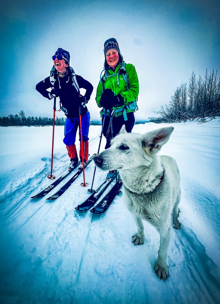 The next morning we met them in town and skied straight out onto the Susitna River, crossing the railroad bridge and following a snowmobile track into open space. Summer must turn this river into something wild and intimidating, but frozen it becomes an invitation. Winter travel here feels generous. The big river, the low northern light, the wide horizon, faint hints of mountains hiding somewhere to the north. We skied at a conversational pace, talking about long trips, airplanes, and the practical dream of shaping a life around movement and weather. Venus trotted alongside us, an old husky with more miles in her legs than most people ever see.