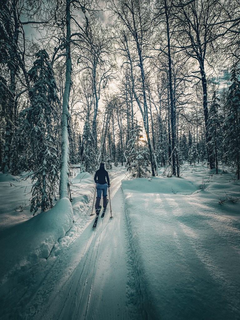 The snow was perfect, Blue Extra perfection, soft and quiet. The sky hung low and misty, like frozen fog, and the lakes unfolded one after another. We lost count somewhere around the third or fourth crossing, looping our way around in a pattern that felt more organic than planned, like tracing a strand of DNA across the landscape. There was almost no one out there. Just the rhythm of skis, the swish and swoosh of movement, the kind of bilateral motion that seems to smooth out a nervous system that has been carrying too much for too long. Months of stress loosened their grip without any fanfare.
