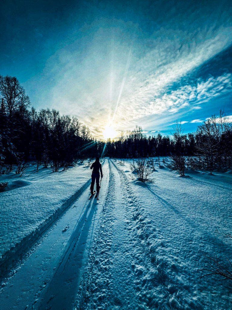 We turned around when it felt right and headed back, full but not spent. That evening, after noticing that some of the trails had been freshly cut for classic, Elaine and I waxed up one more time and slipped out for a short sunset ski. It was our first real classic ski of the year, a quiet gift after a winter that never quite showed up back home. We returned to the cabin in the dark, tired in the best way, knowing that this place was doing exactly what we had hoped. It was giving us winter back.