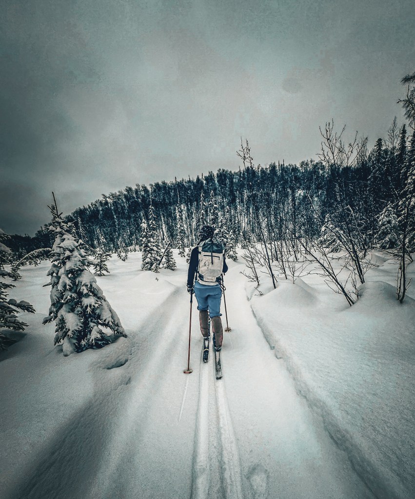 The trail continued north and the country began to feel darker, quieter, more remote. That’s where we met our first real overflow. Water hidden beneath the snow, invisible until it wasn’t. Ankles wet. Skis freezing solid. Bindings locked in place. We stopped, pulled out a scraper, and chipped ice until everything moved again. It was inconvenient and cold and oddly welcome. A small problem we could solve. A little adversity to focus on. We both liked that.