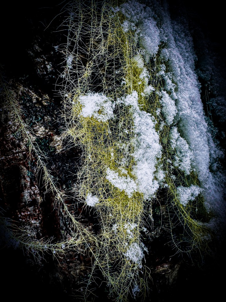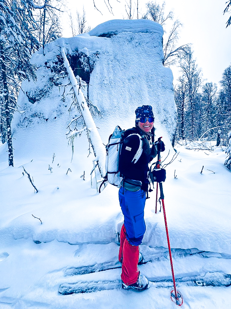 We skied again into the forests and lakes of Susitna country, following a swoopy, draped trail that seemed designed to pull us gently forward. The skiing was joyful on a micro level. Birch bark peeling back in thin white curls. Witch’s Hair hanging from branches, dusted with snow and living up to its name. Along the way were massive glacial erratics, boulders pushed down long ago from the Alaska Range and left half buried in the forest. We skied around one slowly, its edges holding six feet of snow, because it deserved acknowledgment.