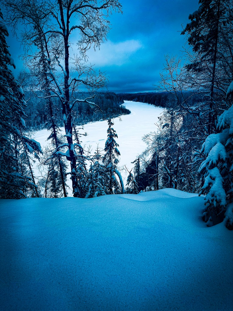 The next day we headed into a new zone, dropping onto a narrower trail that followed the river. At first we passed families out on classic gear, laughing through swoopy turns. We climbed to a high point and enjoyed a fast descent before committing to the river trail proper. Open leads murmured beneath the ice. The trail steepened enough that we sidestepped sections, pushing deeper into country that felt like it might go on forever. I wanted to keep going. The light said otherwise.