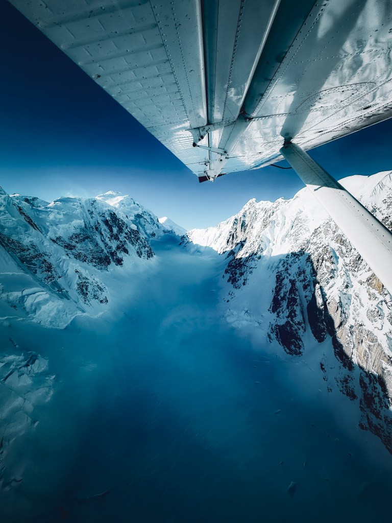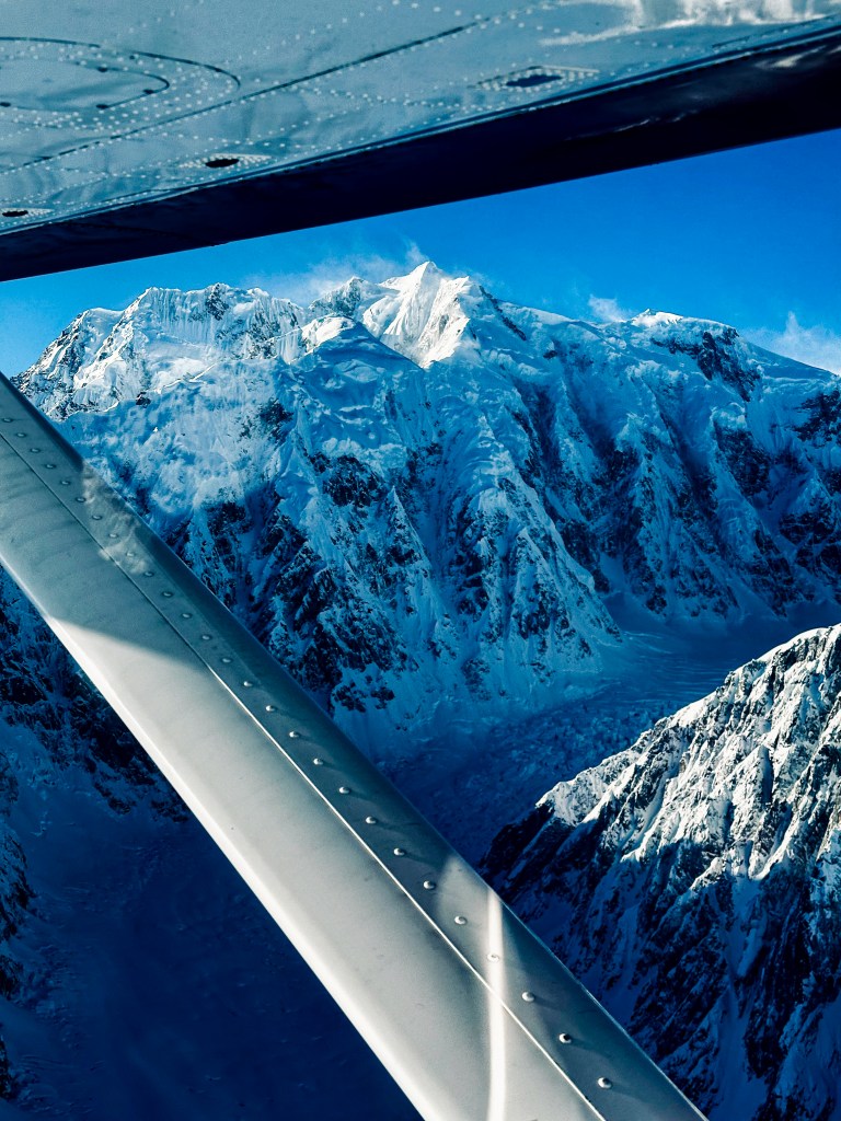 Mount Foraker. Mount Hunter. Denali. Wind tore snow from their summits while the air around us remained smooth. We threaded into amphitheaters and along sheer rock walls at the head of the Tokositna Glacier, followed the ridge of Mount Huntington, and dropped into the Ruth Glacier and its vast amphitheaters. We circled the Sheldon Chalet, flew the Great Gorge, passed the Moose’s Tooth, orange rock cutting through ice and snow.