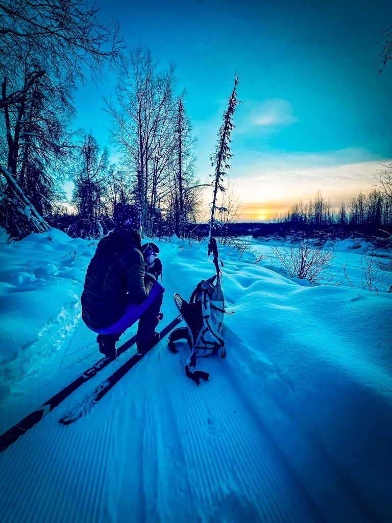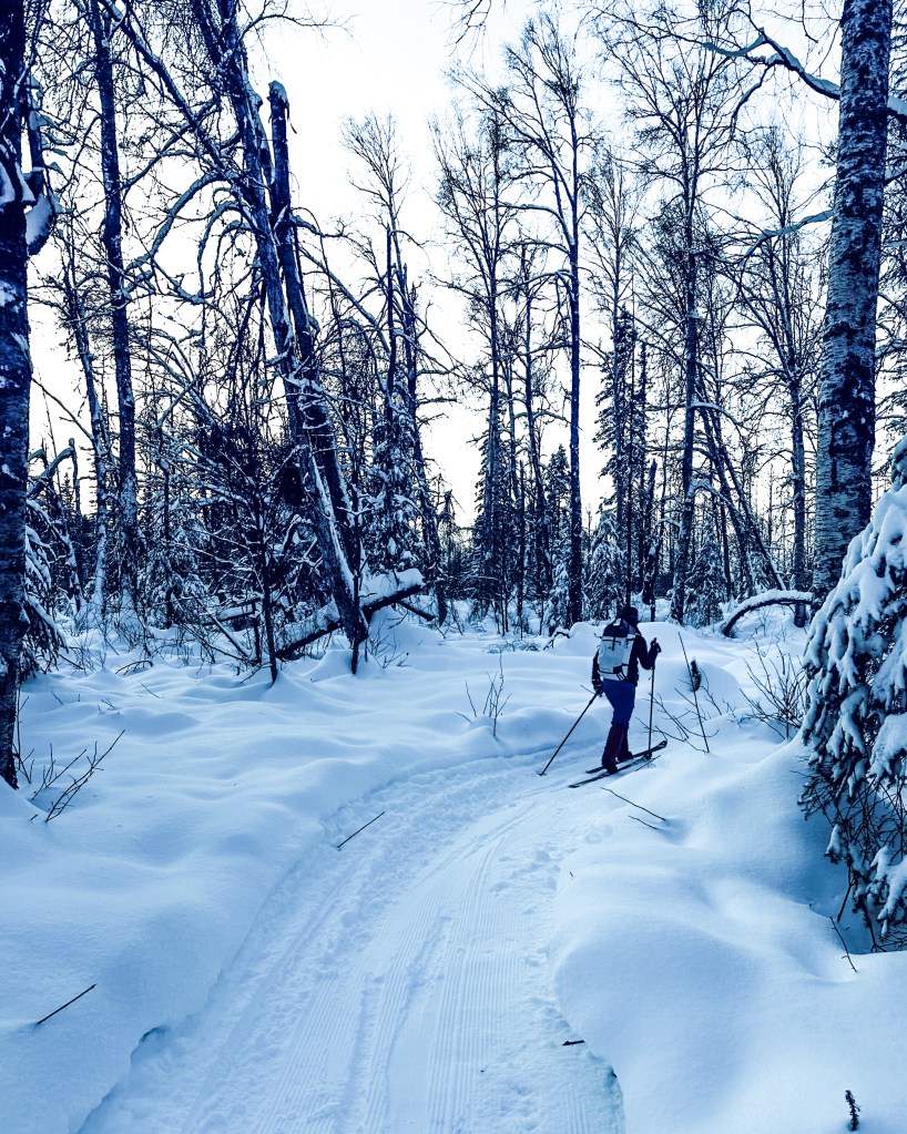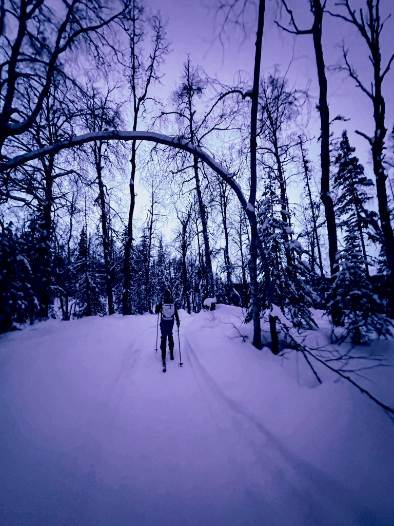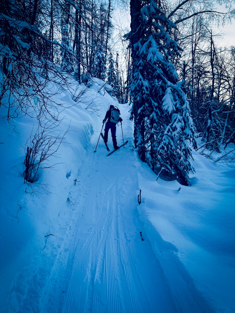 That evening, back on the ground, we ate ramen and headed out again, this time on skis. We pushed up the river trail, then slipped off into the deep woods as daylight began to thin. The world narrowed quickly. Snow-laden spruce closed in. Birch trunks rose pale and skeletal. The trail softened and bent, less about efficiency now than immersion.