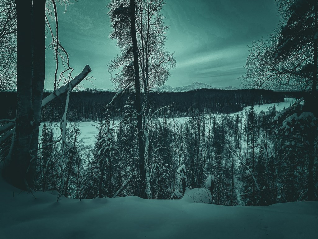 We dropped onto the river itself, wide and quiet, the surface locked in white. Open leads murmured beneath the ice, mesmerizing and daunting. The light lingered impossibly long, orange to pink to violet, and then, through a break in the trees, the three giants stood again on the horizon. Denali. Foraker. Hunter. Dark now. Distant. Somehow, even wilder.