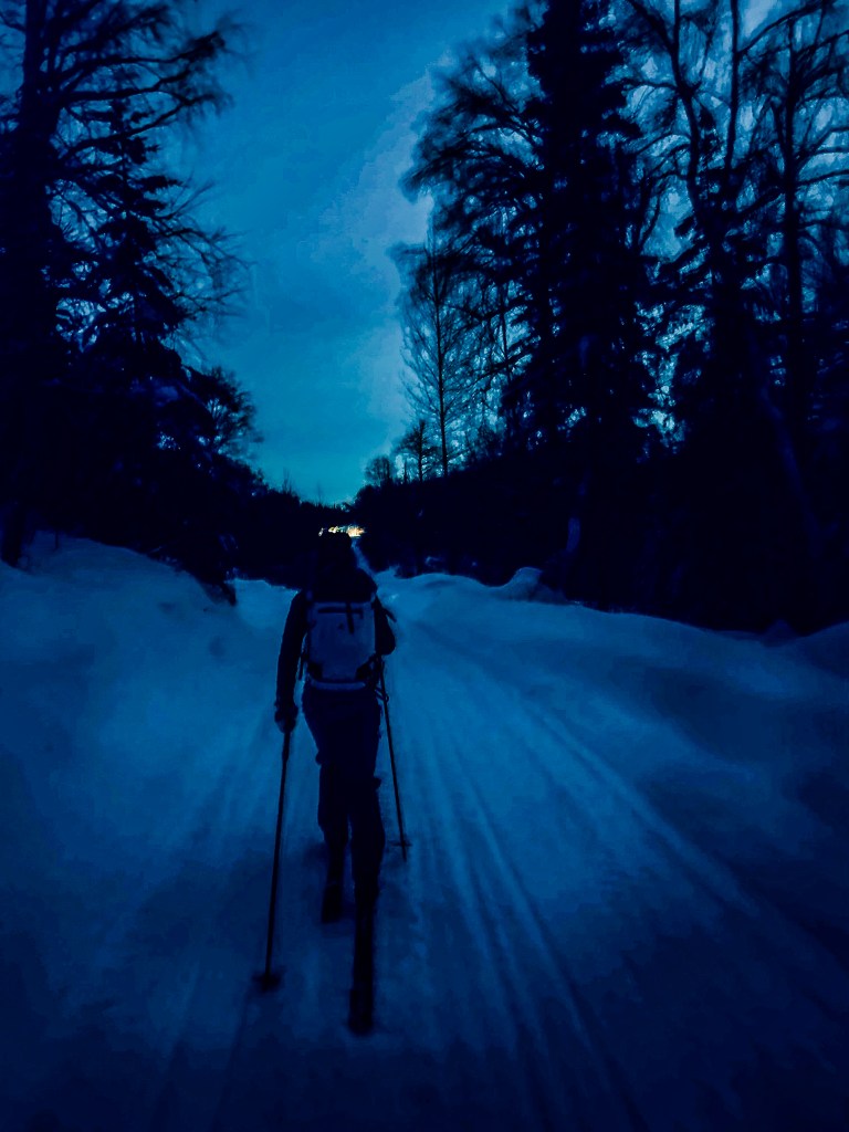 Mist rose from the low ground. Birch branches glowed faintly. Headlamps came on. We skied back toward the car in full dark, the last ones out, the woods closing in behind us as if we had never been there.