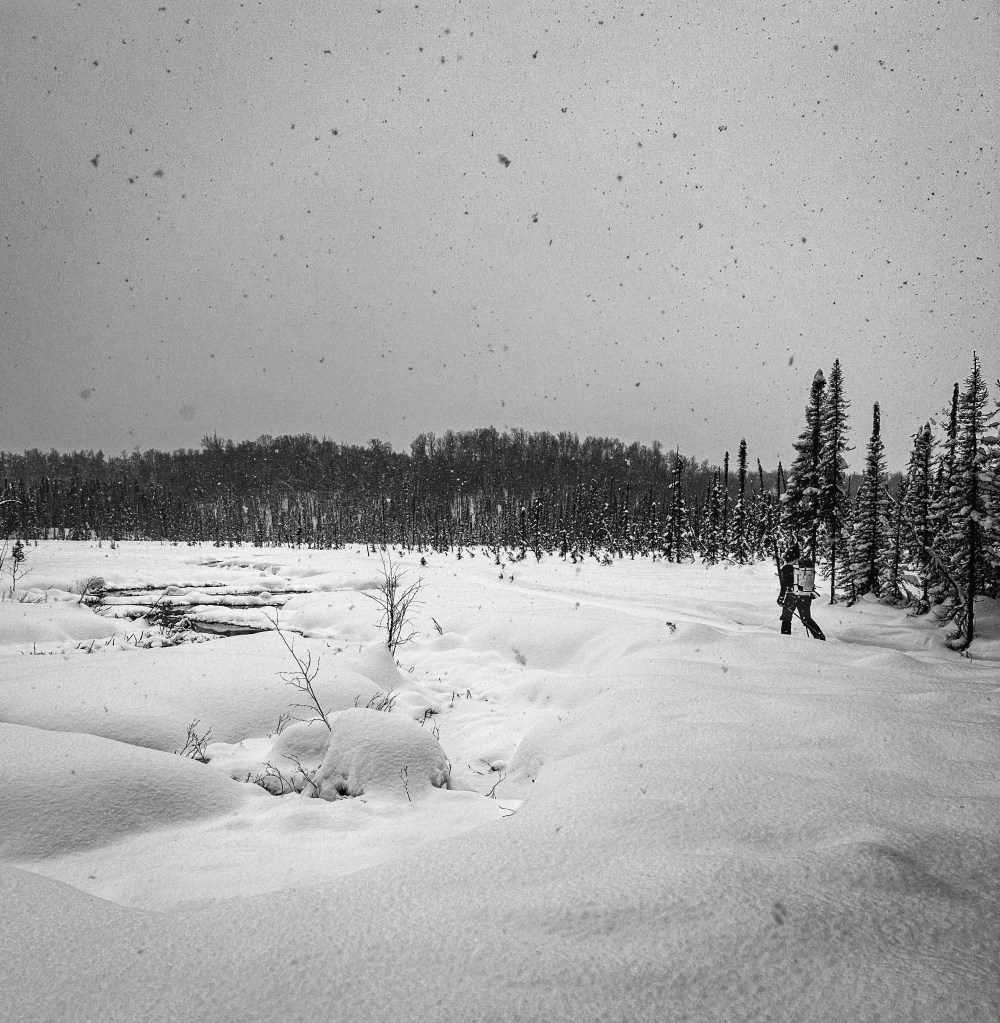 It started snowing hard not long after we set out. Thick flakes falling through the trees. That made our choice to stay low in the forest and off the tundra feel like a good one.