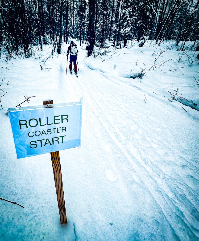 We skied past beautiful frozen lakes and wound through some of the best trails we’d found on the trip. One section was called Roller Coaster, and it skied exactly like the name suggests: a flowing rhythm of short climbs and quick little descents that had us laughing as we skied along.