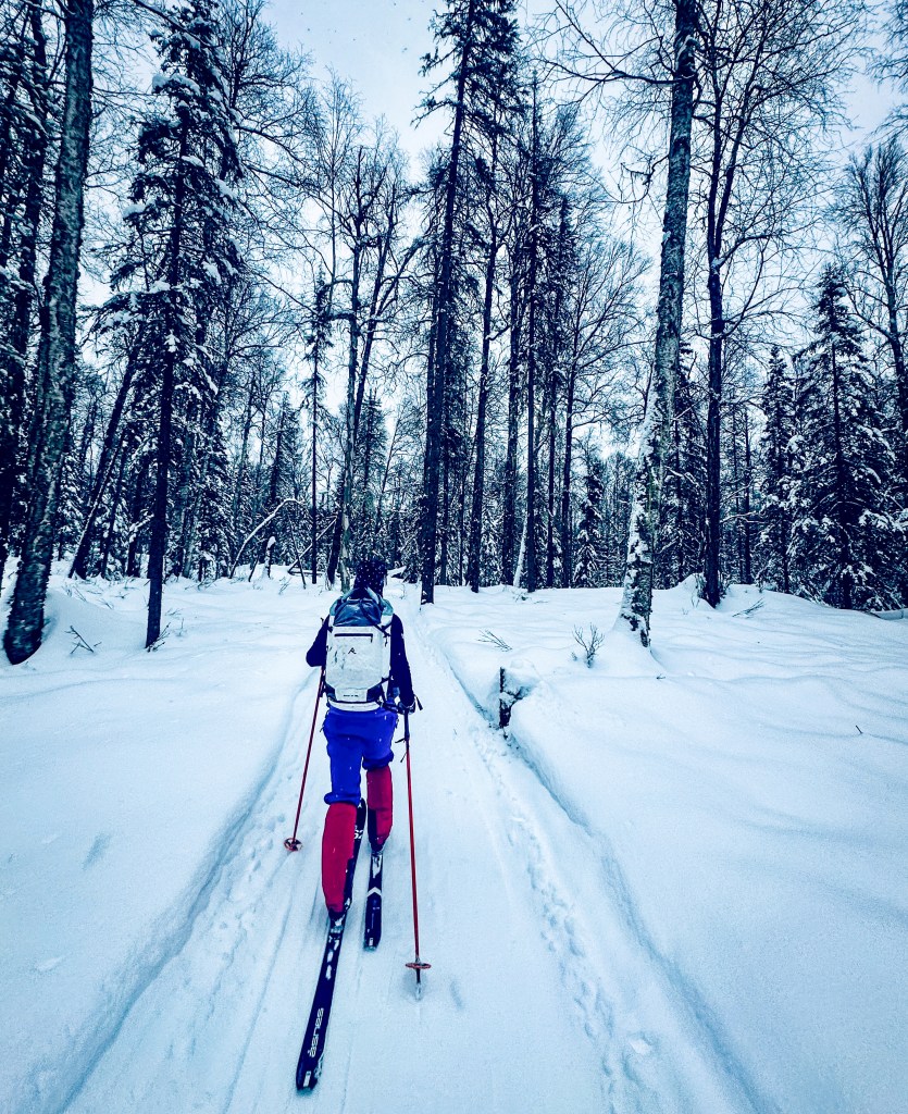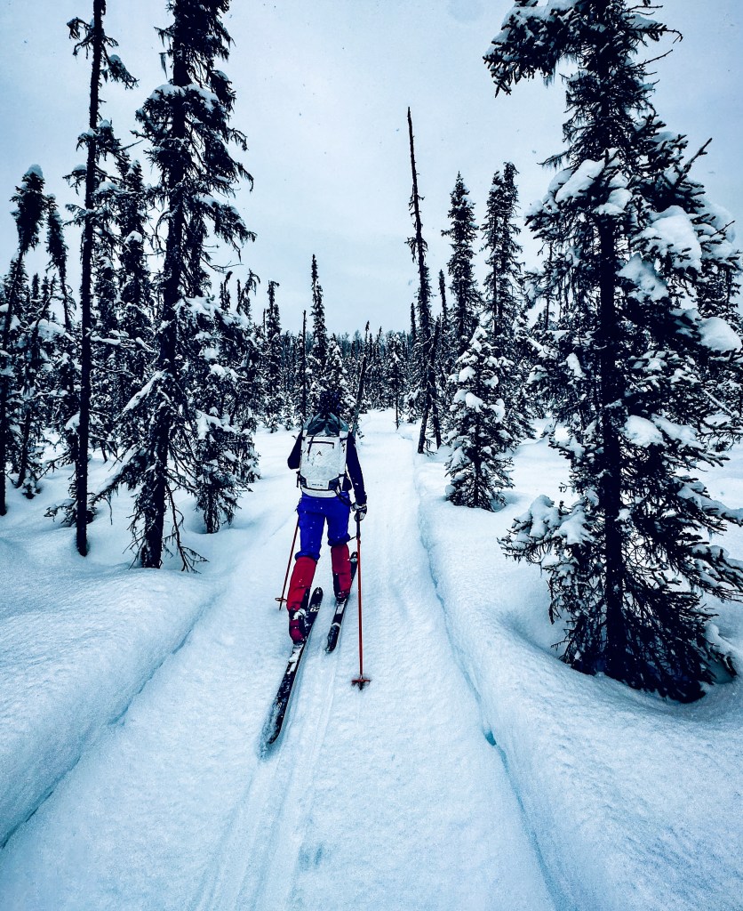 One of the highlights came near the end of the ski when the trail carried us through a dense stand of black spruce. Black spruce forests feel deeply northern. These are the last trees before the land gives way to tundra. Skiing through them feels like stepping into a Jack London story, the quiet broken only by skis sliding through soft snow and the occasional creak of a tree in the cold.