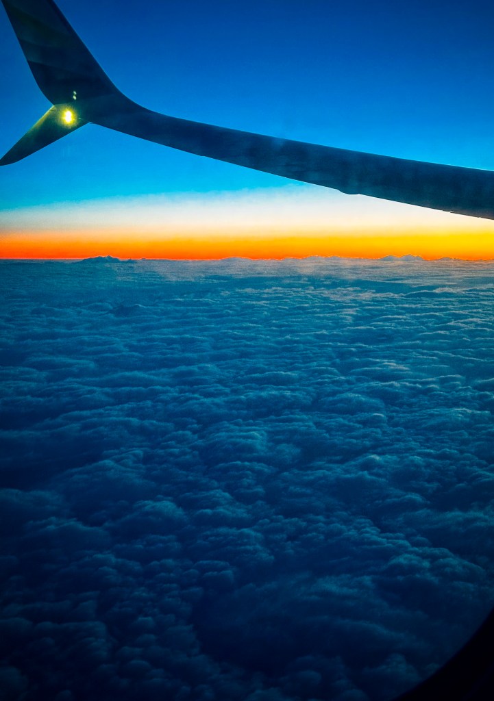 From the airplane window the mountains stretched along the horizon in silhouette above a sea of clouds glowing orange with the sunrise. Alaska fading slowly behind us.